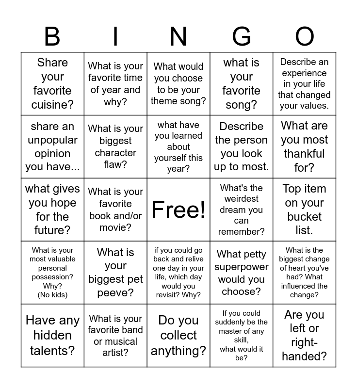 This bingo card has a free space and 35 words: Has social media improved or impaired society?, Favorite place you've ever lived (or would like to) and why?, What would be your last meal?, What is your biggest character flaw?, if you could go back and relive one day in your life, which day would you revisit? Why?, what is your favorite song?, share an unpopular opinion you have..., what is something that is difficult for you but easy for most?, what have you learned about yourself this year?, If you could give a piece of advice to your younger self, what would it be?, what gives you hope for the future?, Describe an experience in your life that changed your values., If you could eliminate anything from your daily routine, what would it be and why?, Time travel back to a historical period or visit the future?, Share your favorite cuisine?, What's the weirdest dream you can remember?, If you could suddenly be the master of any skill, what would it be?, What is your favorite book and/or movie?, What is your most valuable personal possession? Why? (No kids), Are you left or right-handed?, What petty superpower would you choose?, Have any hidden talents?, What is the biggest change of heart you've had? What influenced the change?, What is your favorite band or musical artist?, What would you choose to be your theme song?, What are you most thankful for?, what is your oddest habit?, What is the worst injury you've ever had?, Describe the person you look up to most., Top item on your bucket list., what is the strangest thing you believe in?, Do you collect anything?, What is your biggest pet peeve?, What is your favorite time of year and why? and What is your biggest IRRATIONAL fear?.