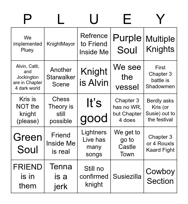 This bingo card has a free space and 24 words: Friend Inside Me is real, Tenna is a jerk, Knight is Alvin, FRIEND is in them, Multiple Knights, We implemented Pluey., Alvin, Catti, and Jockington are in Chapter 4 dark world, KnightMayor, Chapter 3 has no WR, but Chapter 4 does, Lightners Live has many songs, We see the vessel, Kris is NOT the knight (please), We get to go to Castle Town, Chapter 3 or 4 Rouxls Kaard Fight, Another Starwalker Scene, Susiezilla, Berdly asks Kris (or Susie) out to the festival, Refrence to Friend Inside Me, First Chapter 3 battle is Shadowmen, Chess Theory is still possible, Cowboy Section, Green Soul, Purple Soul and Still no confirmed knight.
