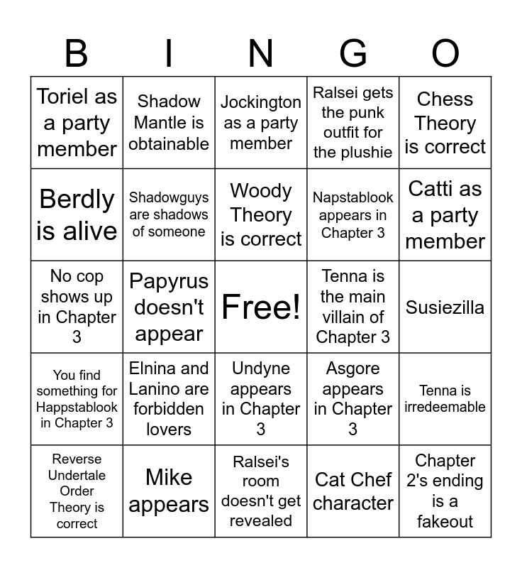 This bingo card has a free space and 24 words: Elnina and Lanino are forbidden lovers, Mike appears, Woody Theory is correct, Reverse Undertale Order Theory is correct, Chess Theory is correct, Toriel as a party member, Berdly is alive, Shadow Mantle is obtainable, Tenna is the main villain of Chapter 3, Undyne appears in Chapter 3, Napstablook appears in Chapter 3, No cop shows up in Chapter 3, Asgore appears in Chapter 3, Tenna is irredeemable, Shadowguys are shadows of someone, Cat Chef character, Susiezilla, Jockington as a party member, Catti as a party member, Papyrus doesn't appear, Chapter 2's ending is a fakeout, You find something for Happstablook in Chapter 3, Ralsei gets the punk outfit for the plushie and Ralsei's room doesn't get revealed.
