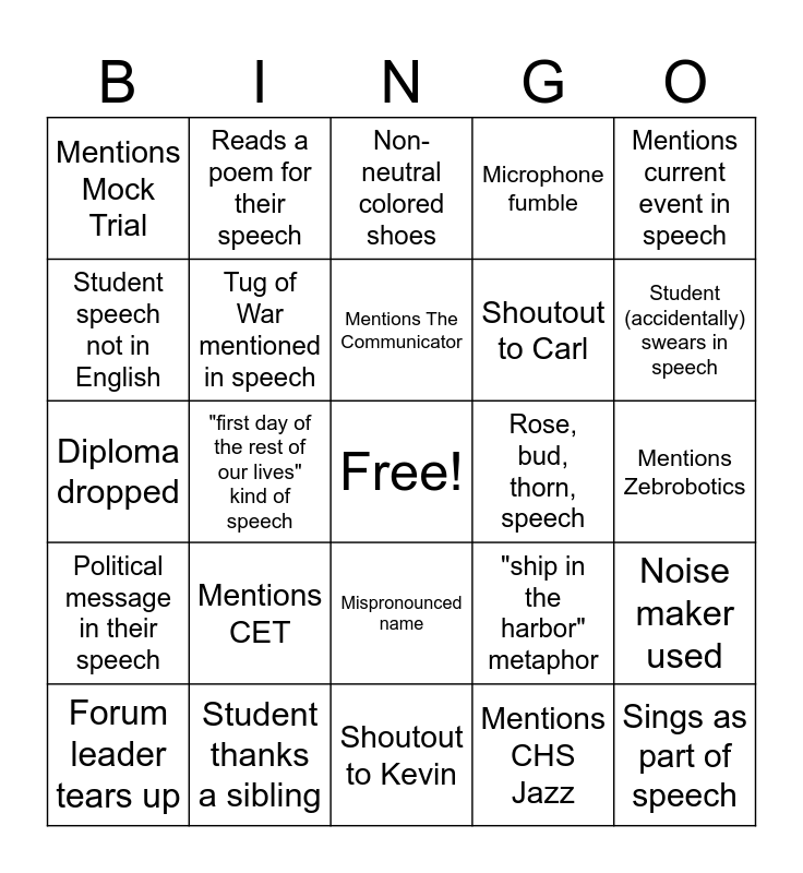 This bingo card has a free space and 27 words: "ship in the harbor" metaphor, "road less traveled", Shoutout to Carl, Shoutout to Kevin, Student speech not in English, Non-neutral colored shoes, Reads a poem for their speech, Political message in their speech, Rose, bud, thorn, speech, Noise maker used, Diploma dropped, Microphone fumble, Forum leader tears up, Student thanks a sibling, Student (accidentally) swears in speech, Mentions spike ball, Tug of War mentioned in speech, Mentions The Communicator, Mentions CET, Mentions Mock Trial, Mentions Zebrobotics, Mentions CHS Jazz, "first day of the rest of our lives" kind of speech, Sings as part of speech, Mispronounced name, Mentions current event in speech and Mentions COVID during speech.