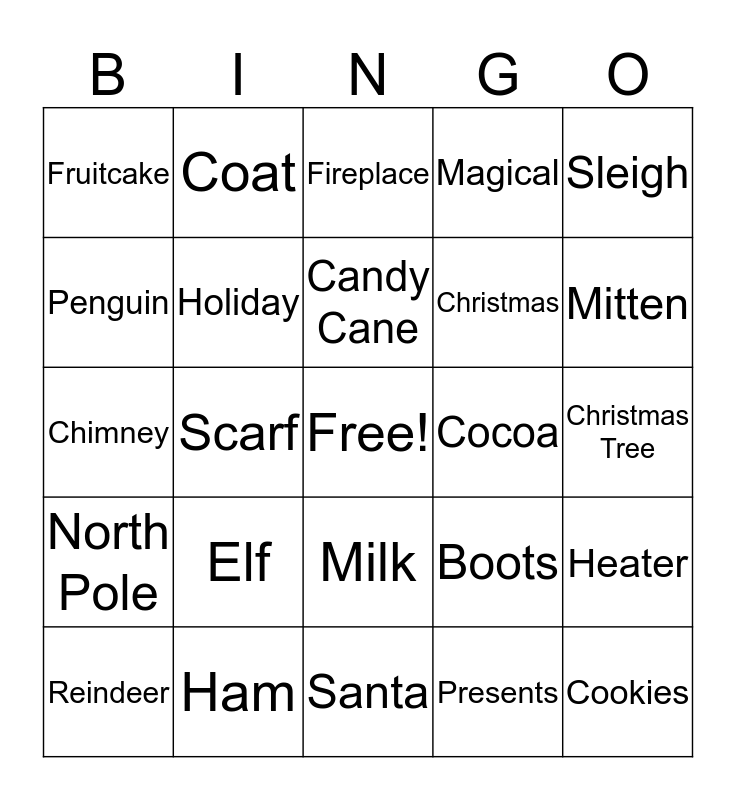 This bingo card has a free space and 27 words: Boots, Ornaments, Christmas, Santa, Penguin, Fireplace, Coat, North Pole, Cocoa, Heater, Chimney, Magical, Reindeer, Ham, Mitten, Stocking, Holiday, Candy Cane, Elf, Fruitcake, Christmas Tree, Presents, Scarf, Cookies, Milk, Sleigh and Gingerbread.