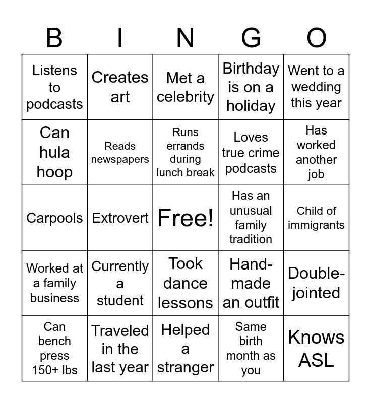 This bingo card has a free space and 139 words: Only child, Twin or triplet, Comes from a big family, Military family, Lived in another country, Hand-made an outfit, In a sports league, Plays an instrument, Volunteers regularly, Read 10+ books this year, Wears contacts, Has a cat, Has a dog, Has an exotic pet, Runs regularly, Has an unusual hobby, Lives with roommates, Has a tattoo, Attends religious services, Is left-handed, Has been scuba diving, Double-jointed, Uses a paper planner, Vegetarian, Introvert, Extrovert, Creates art, Enjoys meeting new people, Writer, Bought a car this year, Quit a bad habit recently, Has a sweet tooth, Has a hidden talent, Child of immigrants, Grew up in this city, Midwestern, Southern, From the west coast, From the east coast, Has a snack stash, Drinks 3+ cups coffee a day, Has worked here 3+ years, Has worked another job, Has a work playlist, Has a favorite pen, Has 0 unread emails, Prefers working in the morning, Prefers working at night, Has worked here <1 year, This is their first job, Bikes to work, Carpools, Runs errands during lunch break, Buys coffee every morning, Buys lunch every day, Played prank on a coworker, Works out before work, Works out after work, Mentor, Going on vacation soon, Same birth month as you, Owns same car brand as you, Never flown on an airplane, Never learned to ride a bike, Collects something, Goes all-out on holiday decorating, Has performed in public, Has a phobia, Has a BFF from high school, Currently a student, Listens to podcasts, Travels often, Belongs to a club, Named after a relative, Has a scar, Has broken a bone, Has a nickname, Birthday is on a holiday, Has a bucket list, Makes New Year’s resolutions, Good cook, Had a secret admirer, Helped a stranger, Got help from a stranger, Worked at a family business, Visited other continents, Took dance lessons, Speaks 2+ languages, Can code, Won a contest, Gardens, Traveled in the last year, Can bake a cake from scratch, Can do basic car repairs, Went to a wedding this year, Climbed a mountain, Moved in the past year, Has a big backyard, Digital nomad, Lives near a coffee shop, Can drive stick, Reads newspapers, Has an annual family vacation, Has been in a hot air balloon, Has taken a cruise, Won a race, Regularly writes reviews, Watches documentaries, Knows how to read tarot, Knows ASL, Appeared in a movie, Met a celebrity, Went viral online, Owns a gaming computer, Knows how to surf, Has an unusual family tradition, Loves true crime podcasts, Likes pineapple on pizza, Been to Disney World, Loves roller coasters, Does Yoga, Can do a cartwheel, Rides horses, Knows martial arts, Started a club, Attended a concert this year, Has a pen pal, Spelling bee champ, Has been on a road trip, Sends Christmas cards, Screams during scary movies, Loves karaoke, Was lead in a play, Can hula hoop, Can bench press 150+ lbs, Good at escape rooms, Has been skydiving, Won an eating competition and Wearing funny socks.
