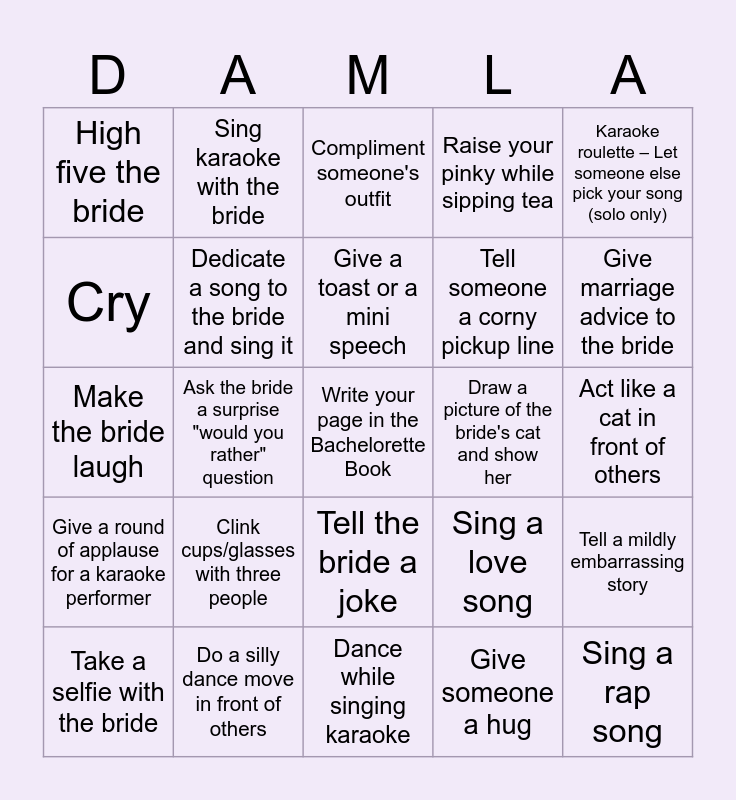 This bingo card has a free space and 24 words: Clink cups/glasses with three people, Do a silly dance move in front of others, Give a toast or a mini speech, Take a selfie with the bride, Karaoke roulette – Let someone else pick your song (solo only), High five the bride, Cry, Sing karaoke with the bride, Draw a picture of the bride's cat and show her, Tell the bride a joke, Tell someone a corny pickup line, Make the bride laugh, Sing a love song, Tell a mildly embarrassing story, Dedicate a song to the bride and sing it, Give someone a hug, Act like a cat in front of others, Compliment someone's outfit, Give marriage advice to the bride, Ask the bride a surprise "would you rather" question, Sing a rap song, Give a round of applause for a karaoke performer, Raise your pinky while sipping tea and Dance while singing karaoke.