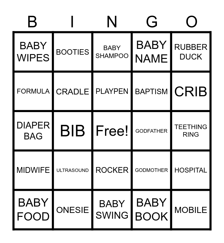 This bingo card has a free space and 49 words: DIAPER, BABY LOTION, BASSINET, BABY BOOK, TEETHING RING, BURP CLOTH, BOOTIES, DOCTOR, BAPTISM, CRAVINGS, FORMULA, BIB, GODMOTHER, MOBILE, BOTTLE, MOTHER GOOSE, BABY SHAMPOO, GODFATHER, RATTLE, BABY WIPES, ONESIE, BABY SWING, BABY NAME, RUBBER DUCK, HIGHCHAIR, ULTRASOUND, PLAYPEN, PATRON SAINT, HOSPITAL, MIDWIFE, BLANKET, ROCKER, BABYSITTER, CAR SEAT, BABY FOOD, CHANGING TABLE, BAPTISMAL GOWN, GRANDMOTHER, CRIB, TEDDY BEAR, NURSERY, MOTHER, GRANDFATHER, LULLABY, DIAPER BAG, CRADLE, FATHER, LOVE and STROLLER.