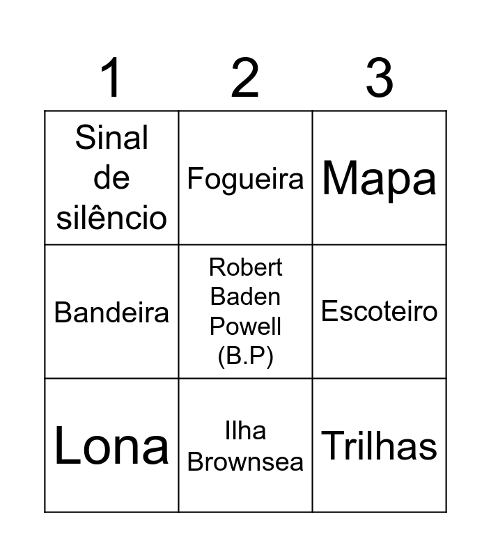 This bingo card has 22 words: Acampamento, Barraca, Fogueira, Nó, Escoteiro, Lona, Sinal de silêncio, Mapa, Lanterna, Primeiros socorros, Trilhas, Bandeira, Atividade ao ar livre, Pioneirismo, Respeito à natureza, Trabalho em equipe, Resgate, Caça ao tesouro, Comunicação, Robert Baden Powell (B.P), Ilha Brownsea and Melhor Possível.
