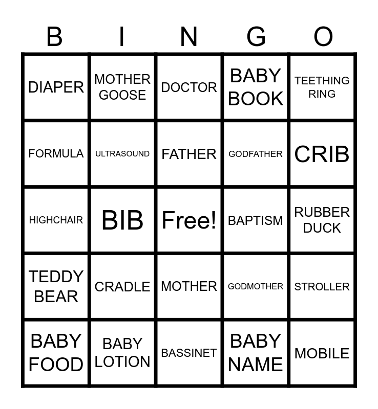 This bingo card has a free space and 49 words: BABY WIPES, ONESIE, BABY SWING, BABY NAME, RUBBER DUCK, BOTTLE, MOTHER GOOSE, BABY SHAMPOO, GODFATHER, RATTLE, FORMULA, BIB, GODMOTHER, MOBILE, BURP CLOTH, BOTTLES, DOCTOR, BAPTISM, CRAVINGS, DIAPER, BABY LOTION, BASSINET, BABY BOOK, TEETHING RING, DIAPER BAG, CRADLE, FATHER, LOVE, STROLLER, TEDDY BEAR, NURSERY, MOTHER, GRANDFATHER, LULLABY, BABY FOOD, CHANGING TABLE, BAPTISMAL GOWN, GRANDMOTHER, CRIB, MIDWIFE, BLANKET, ROCKER, BABYSITTER, CAR SEAT, HIGHCHAIR, ULTRASOUND, PLAYPEN, PATRON SAINT and HOSPITAL.