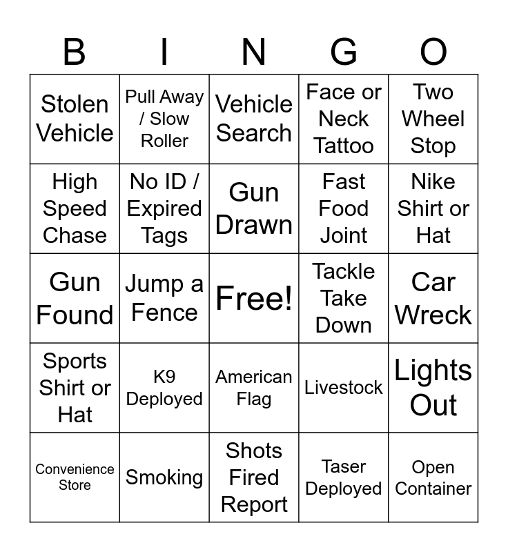 This bingo card has a free space and 35 words: Blood, Hand Cuffs, Ambulance / Fire Truck, No ID / Expired Tags, American Flag, Face or Neck Tattoo, High Speed Chase, Bad Fitting Clothes, Gun Drawn, Foot Pursuit, Gun Found, Two Wheel Stop, Drugs Found, Cat, Stolen Vehicle, Tackle Take Down, Taser Deployed, Jump a Fence, Sports Shirt or Hat, Open Container, Livestock, Convenience Store, Lights Out, Smoking, Vehicle Search, Nike Shirt or Hat, Warrant, Drug Store, Fast Food Joint, Car Wreck, Weed Found, Shots Fired Report, K9 Deployed, Pull Away / Slow Roller and Stuffed Animal / Toy.