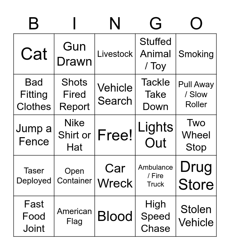 This bingo card has a free space and 35 words: No ID / Expired Tags, Gun Found, Face or Neck Tattoo, Shots Fired Report, Car Wreck, Stuffed Animal / Toy, Bad Fitting Clothes, Hand Cuffs, Vehicle Search, Drugs Found, Jump a Fence, Smoking, Sports Shirt or Hat, K9 Deployed, Cat, Lights Out, High Speed Chase, Nike Shirt or Hat, Taser Deployed, Stolen Vehicle, Ambulance / Fire Truck, Fast Food Joint, Drug Store, American Flag, Livestock, Pull Away / Slow Roller, Weed Found, Warrant, Tackle Take Down, Two Wheel Stop, Convenience Store, Blood, Open Container, Gun Drawn and Foot Pursuit.
