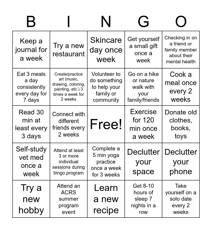 This bingo card has a free space and 24 words: Attend at least 3 or more individual sessions during bingo program, Attend an ACRS summer program event, Volunteer to do something to help your family or community, Try a new hobby, Checking in on a friend or family member about their mental health, Keep a journal for a week, Eat 3 meals a day consistently every day for 7 days, Try a new restaurant, Exercise for 120 min once a week, Complete a 5 min yoga practice once a week for 3 weeks, Go on a hike or nature walk with your family/friends, Read 30 min at least every 3 days, Declutter your space, Declutter your phone, Create/practice art (music, drawing, coloring, painting, etc.) 3 times a week for 2 weeks, Get 8-10 hours of sleep 7 nights in a row, Donate old clothes, books, toys, Skincare day once week, Cook a meal once every 2 weeks, Connect with different friends every 2 weeks, Take yourself on a solo date every 2 weeks, Self-study vet med once a week, Get yourself a small gift once a week and Learn a new recipe.