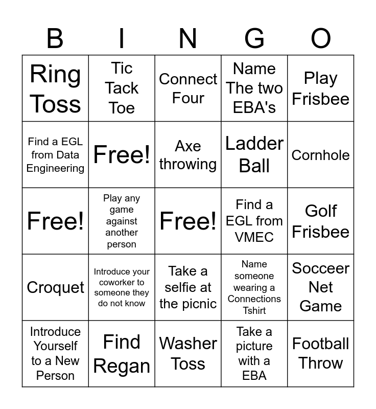 This bingo card has a free space and 24 words: Introduce Yourself to a New Person, Introduce your coworker to someone they do not know, Axe throwing, Take a picture with a EBA, Play Frisbee, Ring Toss, Tic Tack Toe, Connect Four, Find a EGL from VMEC, Golf Frisbee, Free!, Free!, Name someone wearing a Connections Tshirt, Socceer Net Game, Find a EGL from Data Engineering, Find Regan, Washer Toss, Name The two EBA's, Cornhole, Croquet, Play any game against another person, Take a selfie at the picnic, Ladder Ball and Football Throw.