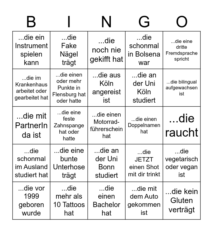 This bingo card has a free space and 24 words: ...die eine bunte Unterhose trägt, ...die mehr als 10 Tattoos hat, ...die aus Köln angereist ist, ...die vor 1999 geboren wurde, ...die eine dritte Fremdsprache spricht, ...die ein Instrument spielen kann, ...die im Krankenhaus arbeitet oder gearbeitet hat, ...die Fake Nägel trägt, ...die einen Doppelnamen hat, ...die an der Uni Bonn studiert, ...die an der Uni Köln studiert, ...die mit PartnerIn da ist, ...die JETZT einen Shot mit dir trinkt, ...die vegetarisch oder vegan ist, ...die einen oder mehr Punkte in Flensburg hat oder hatte, ...die mit dem Auto gekommen ist, ...die raucht, ...die noch nie gekifft hat, ...die bilingual aufgewachsen ist, ...die eine feste Zahnspange hat oder hatte, ...die kein Gluten verträgt, ...die schonmal im Ausland studiert hat, ...die schonmal in Bolsena war and ...die einen Bachelor hat.