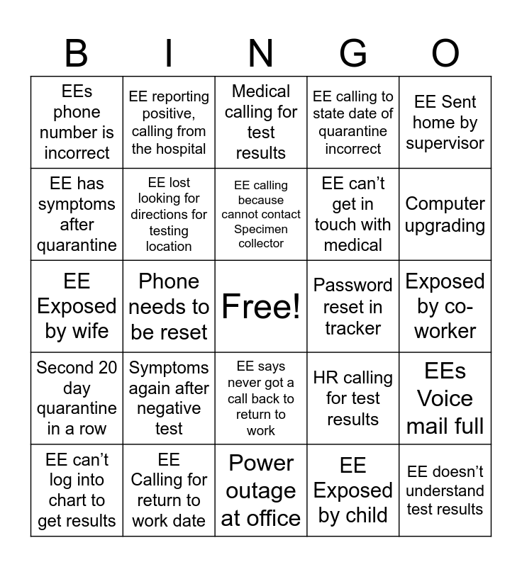 This bingo card has a free space and 87 words: EE can’t remember when symptoms started, EE was told to call by supervisor, doesn’t know why, EE says never got a call back to return to work, EE Exposed to sister, EE Exposed to brother, EE Exposed at a party, EE Exposed at a dinner, EE Exposed by best friend, Tested positive, not vaccinated and now exposed, Covid exempt incorrect, Call dropped, Fax machine calling, EEs Voice mail full, Exposed by co-worker, Nurse referral for testing, EE calling because cannot contact Specimen collector, EE Needs testing rescheduled, EE Missed testing appointment, Late to testing appointment, EE Requests latest testing appointment, Travel testing, EE Exposed by fiancé, EE Exposed by wife, EE Exposed by husband, EE Exposed by child, EE Exposed by cousin, EE Exposed by aunt, EE Exposed by uncle, EE Exposed by grandmother, EE Exposed by grandfather, EE Calling for return to work date, EE Can’t get in touch with medical, Quarantine ending and exposed again, Symptoms again after negative test, EE has symptoms after quarantine, Caller has ALL of the symptoms, Computer upgrading, Computer restarting, Computer frozen, Phone needs to be reset, Can’t find ID in tracker, EE Phone number incorrect in tracker, EE doesn’t know what symptoms they have, Password reset in tracker, Tracker down, EE Sent home by supervisor, EE Self-test positive, EE reporting positive, calling from the hospital, EE wants to know what’s in the swab, EE wants to know what kind of test, EE wants to know how long test results take, Exposed at a family reunion, Second 20 day quarantine in a row, Finished quarantine and now self-reporting positive, EEs badge disabled, trying to go to work, EE can’t get in touch with supervisor, EE can’t get in touch with medical, EE needs disability carriers number, EE incorrectly routed to call center, EE calling to state date of quarantine incorrect, EE lost looking for directions for testing location, EE calling for test results, EE says medical doesn’t have test results, EE states medical hasn’t called them to return to work, EE wants a second covid test, EE doesn’t want to provide vaccination status, EE going to get tested on their own, EE can’t log into chart to get results, EE doesn’t understand test results, EE calling in for their daily call to absentee line, EE asking about quarantine pay, EE asking questions about short term disability, Medical calling for test results, HR calling for test results, EE was going to get tested on his own, now calling to get scheduled, Fast busy when making outbound call, Fire alarm at office, Power outage at office, Internet outage at office, Specimen collector must be in the bathroom, Specimen collector not answering phone, Self – test negative, Self – test – awaiting results, EE completed an at home test, EE calling due to transportation issues, EEs phone number is incorrect and EE no longer employed.