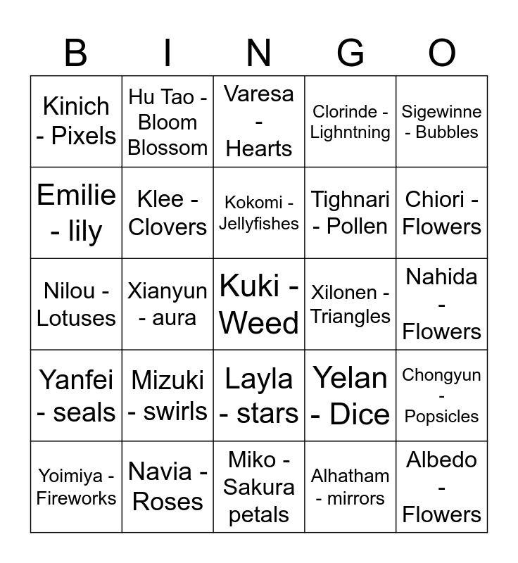This bingo card has 25 words: Mizuki - swirls, Miko - Sakura petals, Kokomi - Jellyfishes, Yoimiya - Fireworks, Sigewinne - Bubbles, Kinich - Pixels, Emilie - lily, Hu Tao - Bloom Blossom, Xilonen - Triangles, Layla - stars, Tighnari - Pollen, Nilou - Lotuses, Yelan - Dice, Chongyun - Popsicles, Klee - Clovers, Albedo - Flowers, Nahida - Flowers, Varesa - Hearts, Chiori - Flowers, Xianyun - aura, Kuki - Weed, Navia - Roses, Yanfei - seals, Clorinde - Lighntning and Alhatham - mirrors.