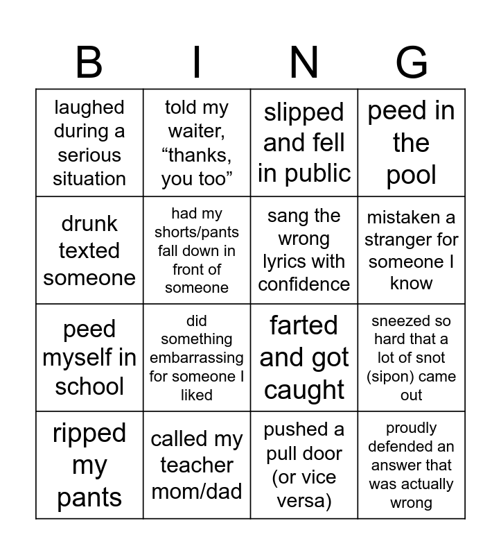 This bingo card has 21 words: called my teacher mom/dad, clogged someone else’s toilet, told my waiter, “thanks, you too”, mistaken a customer for an employee, pushed a pull door (or vice versa), sang the wrong lyrics with confidence, laughed during a serious situation, slipped and fell in public, farted and got caught, mistaken a stranger for someone I know, peed myself in school, peed in the pool, proudly defended an answer that was actually wrong, said something weird while unknowingly unmuted, had my shorts/pants fall down in front of someone, had a mental block during a presentation or speech, ripped my pants, did something embarrassing for someone I liked, drunk texted someone, sneezed so hard that a lot of snot (sipon) came out and walked around with a stain on my pants without anyone telling me.