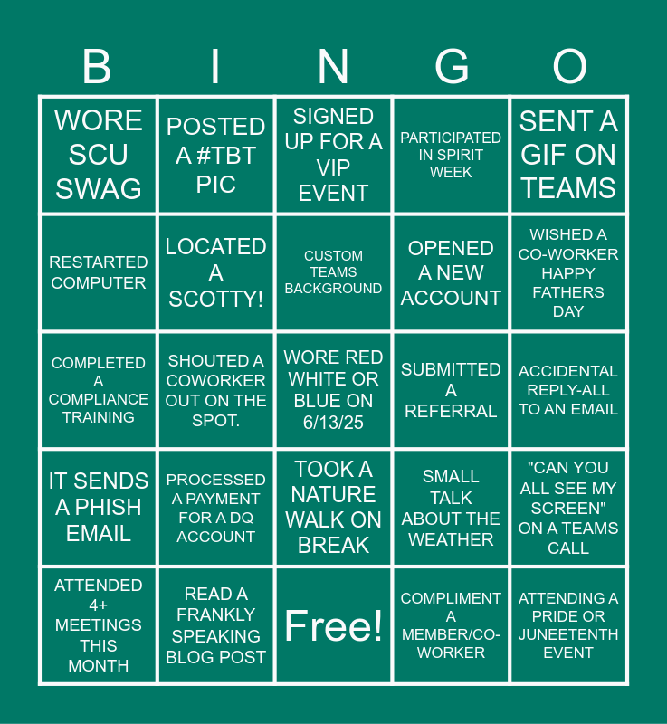 This bingo card has 25 words: IT SENDS A PHISH EMAIL, READ A FRANKLY SPEAKING BLOG POST, WORE RED WHITE OR BLUE ON 6/13/25, COMPLIMENT A MEMBER/CO-WORKER, SENT A GIF ON TEAMS, WORE SCU SWAG, POSTED A #TBT PIC, SIGNED UP FOR A VIP EVENT, SUBMITTED A REFERRAL, "CAN YOU ALL SEE MY SCREEN" ON A TEAMS CALL, RESTARTED COMPUTER, LOCATED A SCOTTY!, Free!, SMALL TALK ABOUT THE WEATHER, WISHED A CO-WORKER HAPPY FATHERS DAY, ATTENDED 4+ MEETINGS THIS MONTH, SHOUTED A COWORKER OUT ON THE SPOT., CUSTOM TEAMS BACKGROUND, OPENED A NEW ACCOUNT, ACCIDENTAL REPLY-ALL TO AN EMAIL, COMPLETED A COMPLIANCE TRAINING, PROCESSED A PAYMENT FOR A DQ ACCOUNT, TOOK A NATURE WALK ON BREAK, PARTICIPATED IN SPIRIT WEEK and ATTENDING A PRIDE OR JUNEETENTH EVENT.
