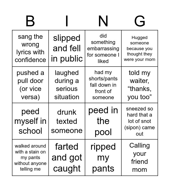 This bingo card has 25 words: called my teacher mom/dad, clogged someone else’s toilet, told my waiter, “thanks, you too”, mistaken a customer for an employee, pushed a pull door (or vice versa), sang the wrong lyrics with confidence, laughed during a serious situation, slipped and fell in public, farted and got caught, mistaken a stranger for someone I know, peed myself in school, peed in the pool, proudly defended an answer that was actually wrong, said something weird while unknowingly unmuted, had my shorts/pants fall down in front of someone, had a mental block during a presentation or speech, ripped my pants, did something embarrassing for someone I liked, drunk texted someone, sneezed so hard that a lot of snot (sipon) came out, walked around with a stain on my pants without anyone telling me, Calling your teacher mom, Calling your friend mom, Hugged someone because you thought they were your mom and Walking into a glass door.