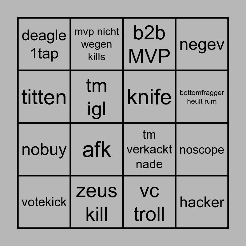 This bingo card has 16 words: zeus kill, noscope, b2b MVP, deagle 1tap, nobuy, mvp nicht wegen kills, tm verkackt nade, vc troll, titten, tm igl, votekick, negev, afk, bottomfragger heult rum, knife and hacker.