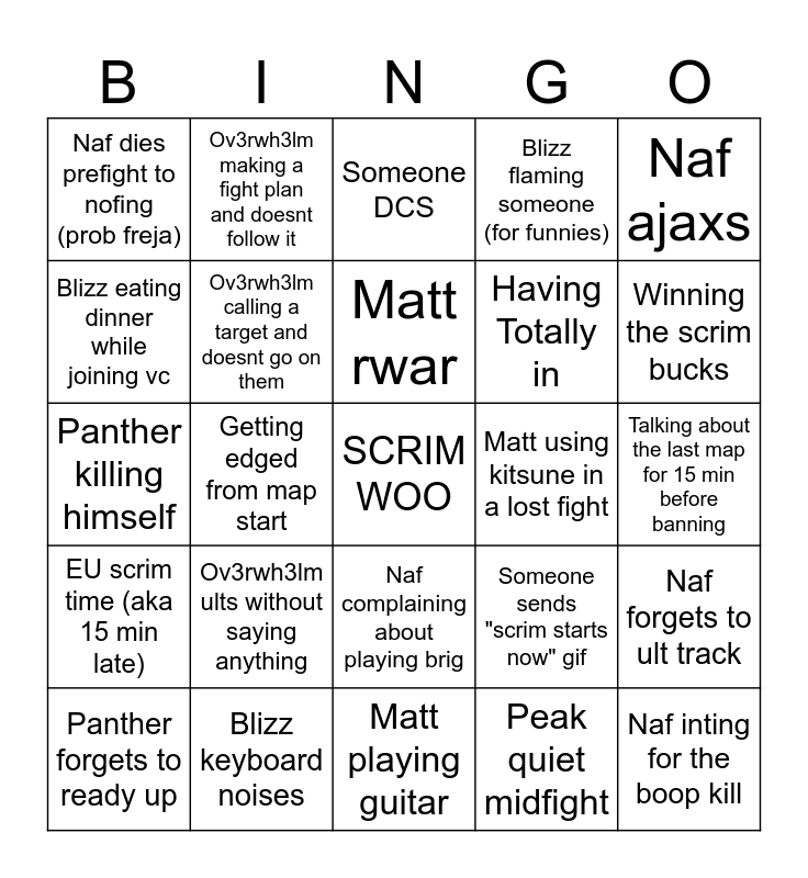 This bingo card has a free space and 24 words: Ov3rwh3lm ults without saying anything, Blizz keyboard noises, Matt rwar, Panther forgets to ready up, Naf ajaxs, Naf dies prefight to nofing (prob freja), Blizz eating dinner while joining vc, Ov3rwh3lm making a fight plan and doesnt follow it, Matt using kitsune in a lost fight, Naf complaining about playing brig, Having Totally in, Panther killing himself, Someone sends "scrim starts now" gif, Naf forgets to ult track, Ov3rwh3lm calling a target and doesnt go on them, Peak quiet midfight, Talking about the last map for 15 min before banning, Someone DCS, Winning the scrim bucks, Getting edged from map start, Naf inting for the boop kill, EU scrim time (aka 15 min late), Blizz flaming someone (for funnies) and Matt playing guitar.