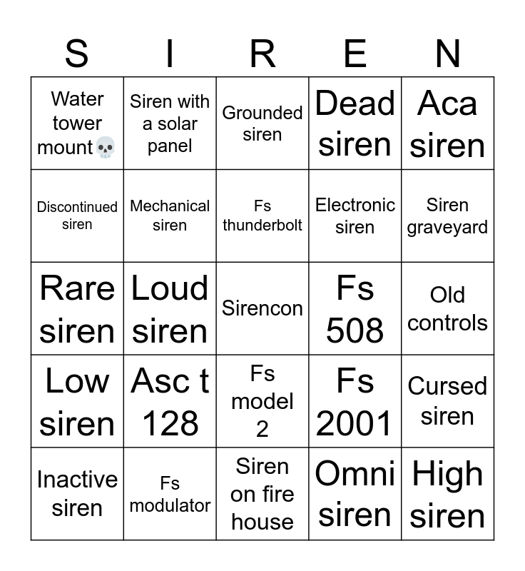This bingo card has a free space and 24 words: Asc t 128, Fs modulator, Fs thunderbolt, Inactive siren, Aca siren, Water tower mount💀, Discontinued siren, Siren with a solar panel, Fs 508, Fs model 2, Electronic siren, Rare siren, Fs 2001, Cursed siren, Mechanical siren, Omni siren, Old controls, Grounded siren, Siren graveyard, Loud siren, High siren, Low siren, Dead siren and Siren on fire house.