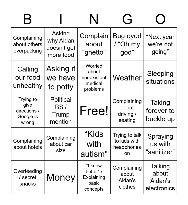 This bingo card has a free space and 24 words: Complaining about car size, Money, Worried about nonexistent medical problems, Overfeeding / secret snacks, “Next year we’re not going”, Complaining about others overpacking, Calling our food unhealthy, Asking why Aidan doesn’t get more food, Complaining about driving / seating, “Kids with autism”, Weather, Trying to give directions / Google is wrong, Trying to talk to kids with headphones on, Spraying us with “sanitizer”, Asking if we have to potty, Complaining about Aidan’s clothes, Taking forever to buckle up, Complain about “ghetto”, Sleeping situations, Political BS / Trump mention, Talking about Aidan’s electronics, Complaining about hotels, Bug eyed / “Oh my god” and “I know better” / Explaining basic concepts.