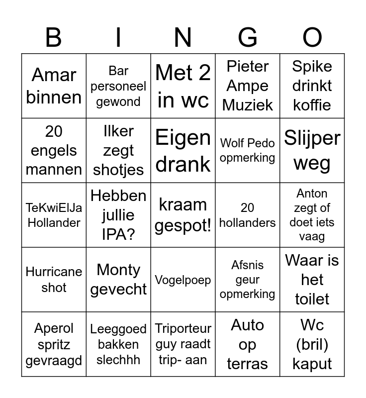 This bingo card has a free space and 24 words: Monty gevecht, Leeggoed bakken slechhh, Eigen drank, Aperol spritz gevraagd, Spike drinkt koffie, Amar binnen, 20 engels mannen, Bar personeel gewond, 20 hollanders, Vogelpoep, Wolf Pedo opmerking, TeKwiElJa Hollander, Afsnis geur opmerking, Waar is het toilet, Ilker zegt shotjes, Auto op terras, Anton zegt of doet iets vaag, Met 2 in wc, Slijper weg, Hebben jullie IPA?, Wc (bril) kaput, Hurricane shot, Pieter Ampe Muziek and Triporteur guy raadt trip- aan.