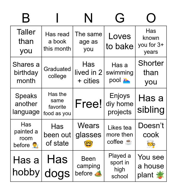 This bingo card has a free space and 24 words: Has been out of state, Has dogs, Has lived in 2 + cities, Has a hobby, Has known you for 3+ years, Taller than you, Shares a birthday month, Has read a book this month, Enjoys diy home projects, Wears glasses π€, Has a swimming pool πββοΈ, Speaks another language, Likes tea more then coffee βοΈ, Doesnβt cook π§βπ³, Graduated college, Played a sport in high school, Has a sibling, The same age as you, Shorter than you, Has the same favorite food as you, You see a house plant πͺ΄, Has painted a room before π¨βπ¨, Loves to bake and Been camping before ποΈ.