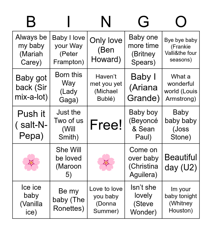 This bingo card has a free space and 54 words: 🌸, 🌸, 🌸, 🌸, 🌸, Baby (Justin Bieber), Baby one more time (Britney Spears), Baby, I love your Way (Big mountain), Baby got back (Sir mix-a-lot), Baby Can I hold you (Tracey Chapman), Always be my baby (Mariah Carey), Blitz, baby (Jung), Be my baby (The Ronettes), Ice ice baby (Vanilla ice), Tell me baby (Red hot chili peppers), Love to love you baby (Donna Summer), Im your baby tonight (Whitney Houston), Baby I (Ariana Grande), Hey baby (DJ Ötzi), Baby baby baby (Joss Stone), Come on over baby (Christina Aguilera), Be my baby (Ariana Grande), Baby boy (Beyoncé & Sean Paul), Bye bye baby (Frankie Valli&the four seasons), Baby be mine (Michael Jackson), Baby I love your Way (Peter Frampton), Hey baby (drop it to the floor (Pitbull& T-Pain), Baby, you make me crazy (Sam Smith), I love you baby (Surf Mesa & Emilee), Isn’t she lovely (Steve Wonder), Hey mama (Black eyed peas), Here comes the Sun (Beatles), Haven’t met you y’et (Michael Bublé), Pumped up kids (Foster the people), Only love (Ben Howard), I’m coming out (Diana Ross), Push it ( salt-N-Pepa), Beautiful day (U2), The Way you make me feel (Michael Jackson), Born this Way (Lady Gaga), Sweet child o’mine (Guns n’ roses), Angels (Robbie Williams), Mama Said (Lukas Graham), Mamma mia (ABBA), She Will be loved (Maroon 5), Your song (Elton John), Make you feel my love (Adele), My Girl (The temptations), Haven’t met you yet (Michael Bublé), Just the Two of us (Will Smith), What a wonderful world (Louis Armstrong), Count on me (Bruno Mars), A beautiful life (Christopher) and Pregnant (Phlake).
