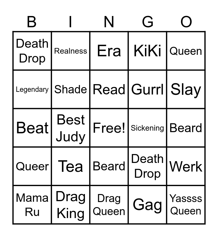 This bingo card has a free space and 28 words: Werk, Trade, Gurrl, Gag, Legendary, Era, Realness, Queer, Sickening, Mama Ru, Beat, KiKi, Drag King, Drag Queen, Slay, Here for It, Tea, Shade, Read, Beard, Death Drop, Queen, Yassss Queen, Best Judy, Beard, Death Drop, Queen and Yassss.
