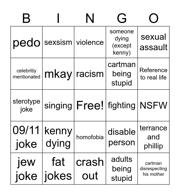 This bingo card has a free space and 24 words: kenny dying, fat jokes, racism, jew joke, sexual assault, pedo, celebritiy mentionated, sexsism, fighting, homofobia, cartman being stupid, sterotype joke, disable person, terrance and phillip, mkay, adults being stupid, NSFW, violence, Reference to real life, singing, cartman disrespecting his mother, 09/11 joke, someone dying (except kenny) and crash out.