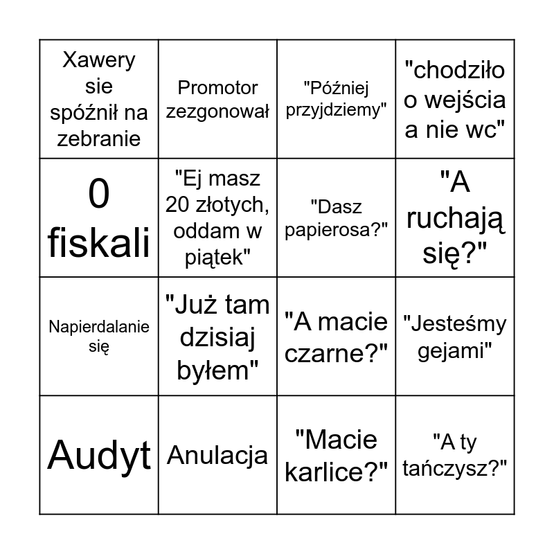 This bingo card has 16 words: Anulacja, "Jesteśmy gejami", "Później przyjdziemy", Xawery sie spóźnił na zebranie, Napierdalanie się, Promotor zezgonował, "A macie czarne?", "Macie karlice?", 0 fiskali, "Ej masz 20 złotych, oddam w piątek", Audyt, "chodziło o wejścia a nie wc", "Już tam dzisiaj byłem", "A ruchają się?", "Dasz papierosa?" and "A ty tańczysz?".