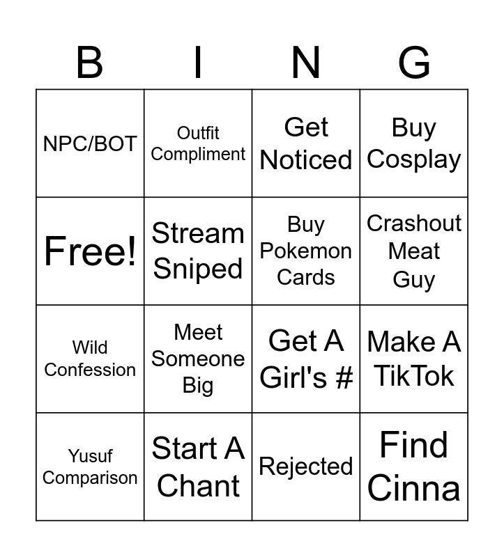 This bingo card has 16 words: Start A Chant, Make A TikTok, Get Noticed, NPC/BOT, Wild Confession, Outfit Compliment, Get A Girl's #, Rejected, Free!, Stream Sniped, Yusuf Comparison, Buy Cosplay, Meet Someone Big, Crashout Meat Guy, Buy Pokemon Cards and Find Cinna.