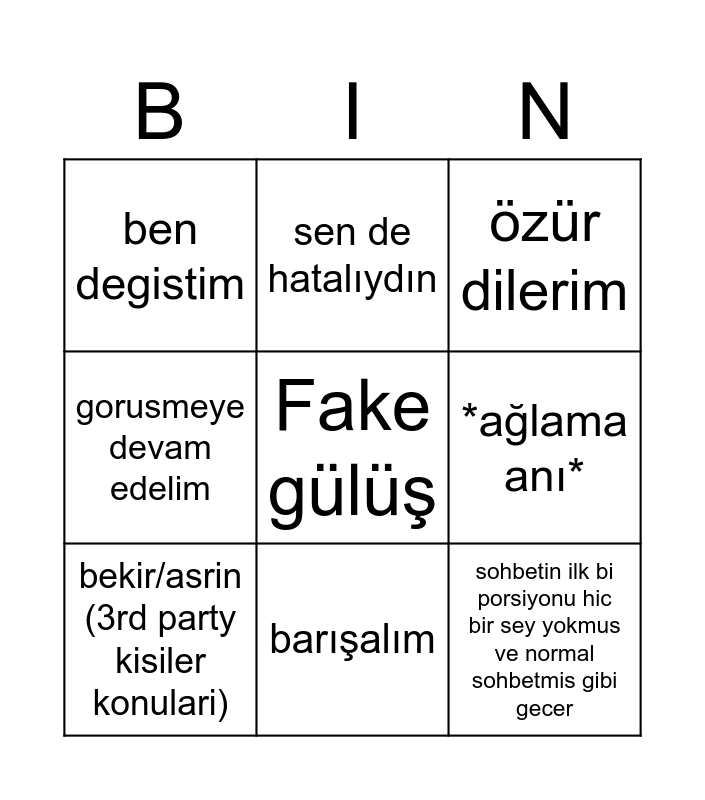 This bingo card has a free space and 8 words: *ağlama anı*, özür dilerim, sen de hatalıydın, bekir/asrin (3rd party kisiler konulari), ben degistim, sohbetin ilk bi porsiyonu hic bir sey yokmus ve normal sohbetmis gibi gecer, gorusmeye devam edelim and barışalım.