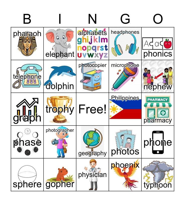 This bingo card has 24 images, a free space and 24 words: sphere, photographer, photocopier, phoenix, phonics, pharaoh, elephant, alphabets, Philippines, pharmacy, graph, dolphin, photos, phone, telephone, gopher, physician, headphones, nephew, phase, trophy, geography, microphone and typhoon.