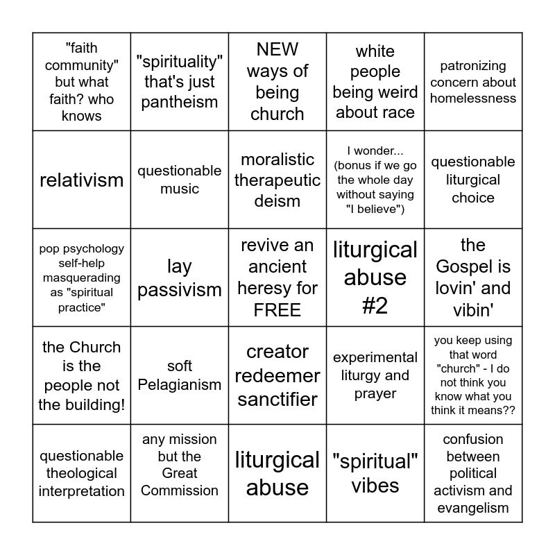 This bingo card has a free space and 31 words: liturgical abuse, "incarnational", lay passivism, you keep using that word "Gospel" - I do not think it means what you think it means, "faith community" but what faith? who knows, NEW ways of being church, questionable music, experimental liturgy and prayer, liturgical abuse #2, "spiritual" vibes, the Gospel is lovin' and vibin', confusion between political activism and evangelism, liturgical cringe, vague progressive yearning vibes, questionable liturgical choice, self-laudatory moralism, you keep using that word "church" - I do not think you know what you think it means??, soft Pelagianism, the Church is the people not the building!, creator redeemer sanctifier, patronizing concern about homelessness, irrelevant comment, questionable theological interpretation, "spirituality" that's just pantheism, I wonder... (bonus if we go the whole day without saying "I believe"), relativism, white people being weird about race, pop psychology self-help masquerading as "spiritual practice", any mission but the Great Commission, moralistic therapeutic deism and the gospel is... housing policy?.