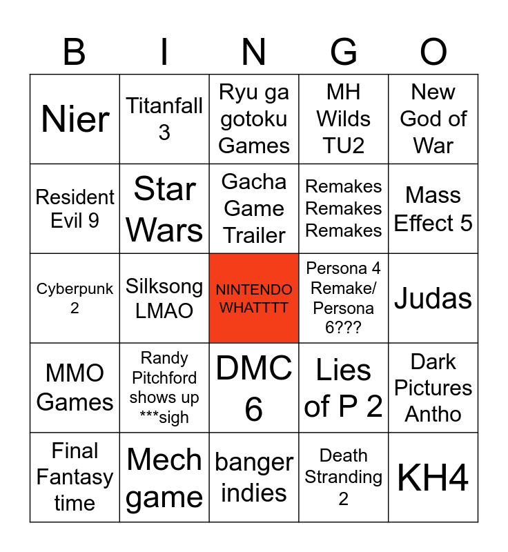 This bingo card has a free space and 24 words: Randy Pitchford shows up ***sigh, Mech game, Gacha Game Trailer, Final Fantasy time, New God of War, Nier, Resident Evil 9, Titanfall 3, Persona 4 Remake/ Persona 6???, DMC 6, Remakes Remakes Remakes, Cyberpunk 2, Lies of P 2, Dark Pictures Antho, Star Wars, Death Stranding 2, Judas, Ryu ga gotoku Games, Mass Effect 5, Silksong LMAO, KH4, MMO Games, MH Wilds TU2 and banger indies.