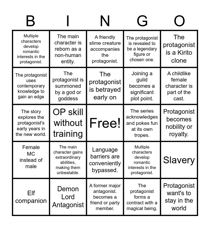 This bingo card has a free space and 24 words: The main character gains extraordinary abilities, making them unbeatable., Demon Lord Antagonist, The protagonist is betrayed early on, Elf companion, The protagonist is a Kirito clone, Multiple characters develop romantic interests in the protagonist., The protagonist uses contemporary knowledge to gain an edge, The main character is reborn as a non-human entity., The series acknowledges and pokes fun at its own tropes., Language barriers are conveniently bypassed., Joining a guild becomes a significant plot point., The story explores the protagonist's early years in the new world., Multiple characters develop romantic interests in the protagonist., Slavery, The protagonist is summoned by a god or goddess, The protagonist forms a contract with a magical being., Protagonist becomes nobility or royalty., A friendly slime creature accompanies the protagonist., A childlike female character is part of the cast., OP skill without training, Protagonist want's to stay in the world, Female MC instead of male, The protagonist is revealed to be a legendary figure or chosen one. and A former major antagonist. becomes a friend or party member..