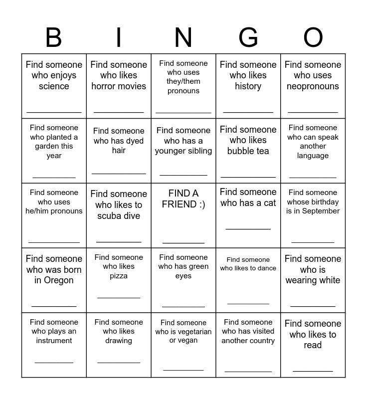 This bingo card has a free space and 24 words: Find someone who likes pizza __________, Find someone who likes drawing __________, Find someone who has a younger sibling __________, Find someone who plays an instrument _________, Find someone who uses neopronouns __________, Find someone who enjoys science ___________, Find someone who planted a garden this year __________, Find someone who likes horror movies __________, Find someone who has a cat _________, Find someone who has green eyes __________, Find someone who likes bubble tea ___________, Find someone who uses he/him pronouns ____________, Find someone who likes to dance ___________, Find someone who is wearing white _________, Find someone who has dyed hair ____________, Find someone who has visited another country ___________, Find someone whose birthday is in September __________, Find someone who uses they/them pronouns _____________, Find someone who can speak another language ___________, Find someone who likes to scuba dive _________, Find someone who likes to read ________, Find someone who was born in Oregon _________, Find someone who likes history __________ and Find someone who is vegetarian or vegan __________.