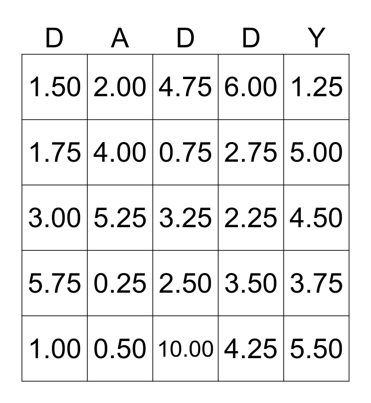 This bingo card has a free space and 24 words: 0.25, 0.50, 0.75, 1.00, 1.25, 1.50, 1.75, 2.00, 2.25, 2.50, 2.75, 3.00, 3.50, 3.75, 4.00, 4.25, 4.50, 4.75, 5.00, 5.25, 5.50, 5.75, 6.00 and 10.00.