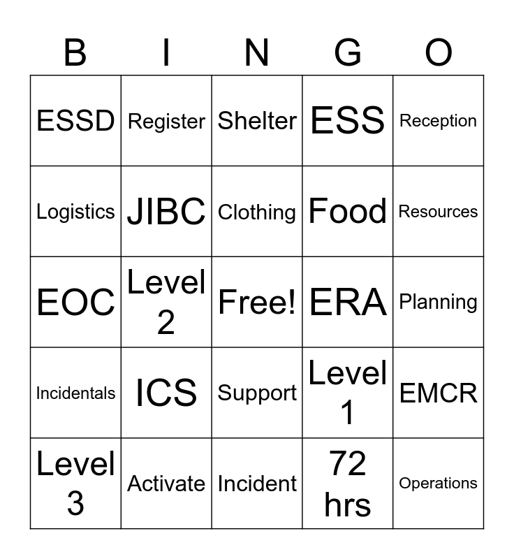 This bingo card has a free space and 24 words: ICS, Activate, Clothing, Level 3, Reception, ESSD, Logistics, Register, ERA, Support, Food, EOC, Level 1, EMCR, JIBC, 72 hrs, Planning, Shelter, Resources, Level 2, Operations, Incidentals, ESS and Incident.