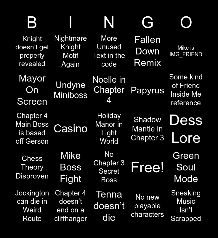 This bingo card has 25 words: Mike Boss Fight, Tenna doesn’t die, Noelle in Chapter 4, Jockington can die in Weird Route, Mike is IMG_FRIEND, Knight doesn’t get properly revealed, Mayor On Screen, Nightmare Knight Motif Again, Shadow Mantle in Chapter 3, No Chapter 3 Secret Boss, Papyrus, Chapter 4 Main Boss is based off Gerson, Free!, Green Soul Mode, Undyne Miniboss, Sneaking Music Isn’t Scrapped, Dess Lore, More Unused Text in the code, Some kind of Friend Inside Me reference, Casino, Holiday Manor in Light World, Chapter 4 doesn’t end on a cliffhanger, Chess Theory Disproven, Fallen Down Remix and No new playable characters.