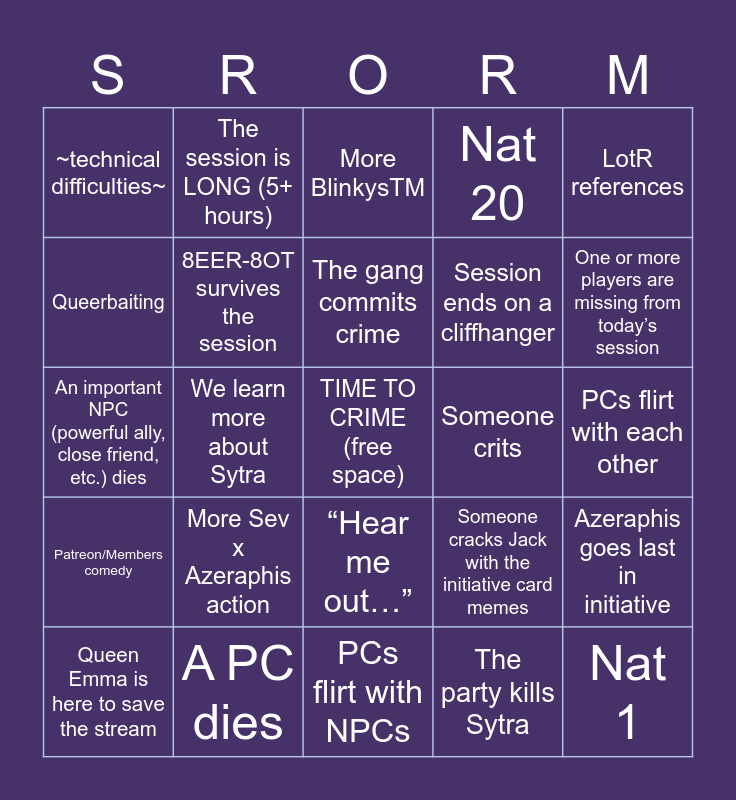 This bingo card has a free space and 33 words: “Naughty/slutty/Asmongold 20”, “How do crits work”, We learn more about Sytra, We find out more about the second docent, Patreon/Members comedy, 8EER-8OT survives the session, LotR references, Queen Emma is here to save the stream, The session is LONG (5+ hours), A PC goes unconscious, The gang commits crime, More BlinkysTM, Someone gets in trouble with the law, BG3 reference, Someone crits, One or more players are missing from today’s session, A PC dies, An important NPC (powerful ally, close friend, etc.) dies, More Sev x Azeraphis action, Someone cracks Jack with the initiative card memes, “Hear me out…”, Something a player says causes reactions off-camera, ~technical difficulties~, PCs flirt with each other, PCs flirt with NPCs, Nat 1, Nat 20, Session ends on a cliffhanger, Queerbaiting, Azeraphis goes last in initiative, Severin goes first in initiative, The party kills Sytra and The party kills Thrasyllos.