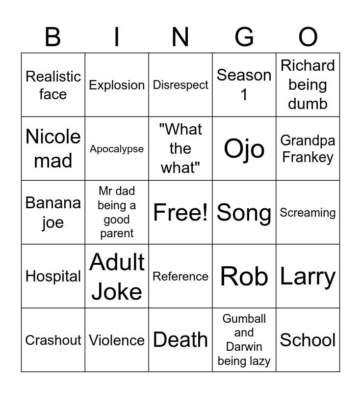 This bingo card has a free space and 24 words: Adult Joke, Violence, "What the what", Crashout, Richard being dumb, Realistic face, Nicole mad, Explosion, Song, Reference, Ojo, Banana joe, Rob, Larry, Apocalypse, Gumball and Darwin being lazy, Screaming, Disrespect, Grandpa Frankey, Mr dad being a good parent, School, Hospital, Season 1 and Death.