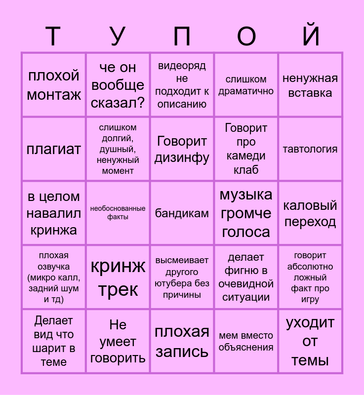 This bingo card has a free space and 24 words: кринж трек, Не умеет говорить, Говорит дизинфу, Делает вид что шарит в теме, ненужная вставка, плохой монтаж, плагиат, че он вообще сказал?, музыка громче голоса, высмеивает другого ютубера без причины, Говорит про камеди клаб, в целом навалил кринжа, делает фигню в очевидной ситуации, говорит абсолютно ложный факт про игру, слишком долгий, душный, ненужный момент, мем вместо объяснения, каловый переход, видеоряд не подходит к описанию, тавтология, необоснованные факты, уходит от темы, плохая озвучка (микро калл, задний шум и тд), слишком драматично and плохая запись.