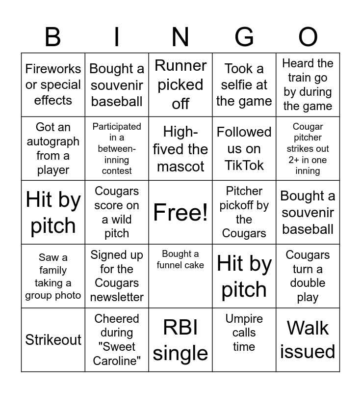 This bingo card has a free space and 87 words: Took a photo with Ozzie the Cougar, Visited the KidZone playground, Bought a funnel cake, Wore Cougars green or navy, Got an autograph from a player, Spotted someone with face paint, Cheered during "Sweet Caroline", Bought 50/50 raffle tickets, Signed up for the Cougars newsletter, Attended on a fireworks night, Cougar hits a home run, Cougar pitcher strikes out 2+ in one inning, Cougars turn a double play, Bought a souvenir baseball, Followed us on TikTok, High-fived the mascot, Took a photo with Annie the Cougar, Got a hot dog, Spotted someone in retro Cougars gear, Wore team merch, Runner picked off, Followed us on Instagram, Hit by pitch, Other team hits a home run, Umpire calls time, Took a photo with Ozzie the Cougar, Visited the KidZone playground, Bought a funnel cake, Wore Cougars green or navy, Spotted someone with face paint, Cheered during "Sweet Caroline", Participated in a between-inning race, Bought 50/50 raffle tickets, Signed up for the Cougars newsletter, Got an autograph from a player, Cougar hits a home run, Cougar pitcher strikes out 2+ in one inning, Cougars turn a double play, Cougars steal a base, Cougars score on a wild pitch, Outfield assist from a Cougar player, Cougar batter gets hit by pitch, Walk-off win or big rally, Pitcher pickoff by the Cougars, Cougar player wears #00 or single digit, Heard the train go by during the game, On the videoboard or fan cam, Bought a souvenir baseball, Spotted someone in retro Cougars gear, Participated in a Cougar roar or chant, Line danced in your section, Got a hot dog or pretzel from the main concourse, Saw a family taking a group photo, Spotted someone with a scorecard, Attended on a fireworks night, Followed us on Instagram, Followed us on TikTok, Joined the email list, Bought something from the team store, Took a selfie at the game, Participated in a between-inning contest, Caught a foul ball, High-fived the mascot, Cheered during the 7th inning stretch, Wore team merch, Home run, Double play, Strikeout, Walk issued, Stolen base, Pitching change, Sacrifice fly, Runner picked off, Hit by pitch, Wild pitch or passed ball, Diving catch, Outfield assist, RBI single, Leadoff batter gets on base, Batter with a broken bat, Pitcher throws over to first base, A player argues a call, Fan does the wave, Ball Blast, Scoreboard trivia, Fireworks or special effects and Umpire calls time.