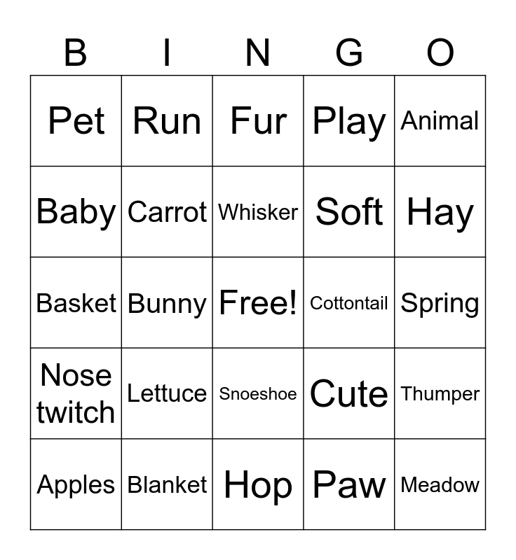 This bingo card has a free space and 31 words: Hop, Ears, Bunny, Hare, Pet, Fur, Carrot, Cute, Cottontail, Paw, Spring, Meadow, Burrow, Soft, Hay, Grass, Thumper, Lettuce, Nose twitch, Snoeshoe, Animal, Celery, Apples, Run, Soft, Baby, Play, Basket, Blanket, Whisker and Snuggle.