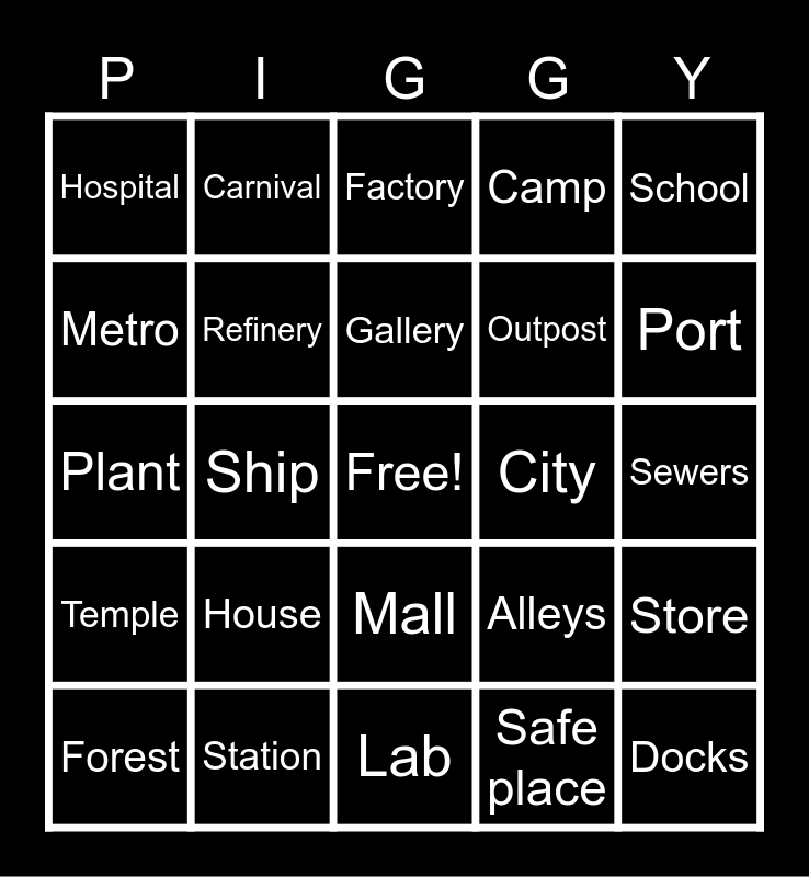 This bingo card has a free space and 24 words: House, Station, Gallery, Forest, School, Hospital, Metro, Carnival, City, Mall, Outpost, Plant, Alleys, Store, Refinery, Safe place, Sewers, Factory, Port, Ship, Docks, Temple, Camp and Lab.