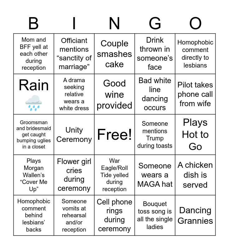 This bingo card has a free space and 24 words: Flower girl cries during ceremony, Someone vomits at rehearsal and/or reception, Good wine provided, Homophobic comment behind lesbians’ backs, Homophobic comment directly to lesbians, Mom and BFF yell at each other during reception, Rain 🌧️, Officiant mentions “sanctity of marriage”, Someone mentions Trump during toasts, War Eagle/Roll Tide yelled during reception, Bad white line dancing occurs, Groomsman and bridesmaid get caught bumping uglies in a closet, Someone wears a MAGA hat, A chicken dish is served, A drama seeking relative wears a white dress, Bouquet toss song is all the single ladies, Plays Hot to Go, Couple smashes cake, Pilot takes phone call from wife, Unity Ceremony, Dancing Grannies, Plays Morgan Wallen’s “Cover Me Up”, Drink thrown in someone’s face and Cell phone rings during ceremony.