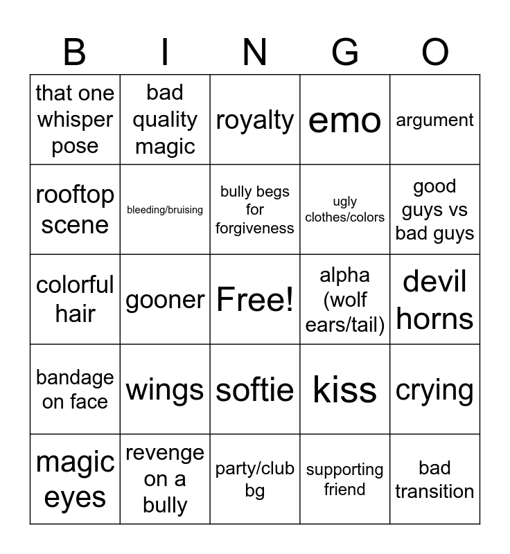 This bingo card has a free space and 24 words: wings, revenge on a bully, bully begs for forgiveness, magic eyes, argument, that one whisper pose, rooftop scene, bad quality magic, alpha (wolf ears/tail), softie, ugly clothes/colors, colorful hair, kiss, crying, bleeding/bruising, supporting friend, devil horns, royalty, good guys vs bad guys, gooner, bad transition, bandage on face, emo and party/club bg.