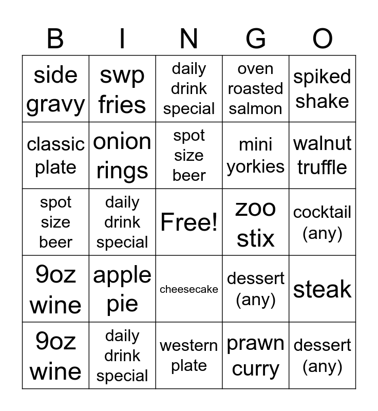 This bingo card has a free space and 24 words: apple pie, daily drink special, spot size beer, 9oz wine, spiked shake, side gravy, classic plate, swp fries, zoo stix, cheesecake, mini yorkies, spot size beer, dessert (any), steak, onion rings, prawn curry, cocktail (any), daily drink special, walnut truffle, daily drink special, dessert (any), 9oz wine, oven roasted salmon and western plate.