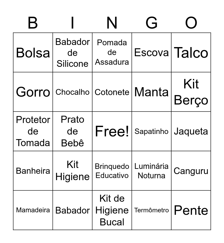 This bingo card has a free space and 62 words: Chupeta, Babador, Algodão, Banheira, Patinho, Trocador, Chocalho, Mordedor, Manta, Luvinha, Escova, Lacinho, Gorro, Pijama, Cobertor, Bolsa, Pente, Talco, Toalha, Cotonete, Sapatinho, Pomada de Assadura, Mamadeira, Termômetro, Fralda de Pano, Protetor de Mamilo, Tapete de Atividades, Cadeirinha de Balanço, Canguru, Bomba Tira-leite, Macacão, Calça, Camisa, Camiseta, Jaqueta, Babador de Silicone, Almofada de Bebê, Cadeira de Alimentação, Prato de Bebê, Colher de Bebê, Protetor de Tomada, Grade de Segurança, Kit Higiene, Travesseiro, Kit Berço, Luminária Noturna, Toalha de Banho com Capuz, Kit de Primeiros Socorros, Bichinho de Pelúcia, Livro de Bebê, Brinquedo Educativo, Kit de Higiene Bucal, Termômetro de Banheira, Mochila de Bebê, Livro de Recordações, Kit de Alimentação, Termômetro Digital, Mordedor de Gel, Caixa de Música, Tapete para Troca de Fralda, Kit Manicure and Jogo de Potes Herméticos.
